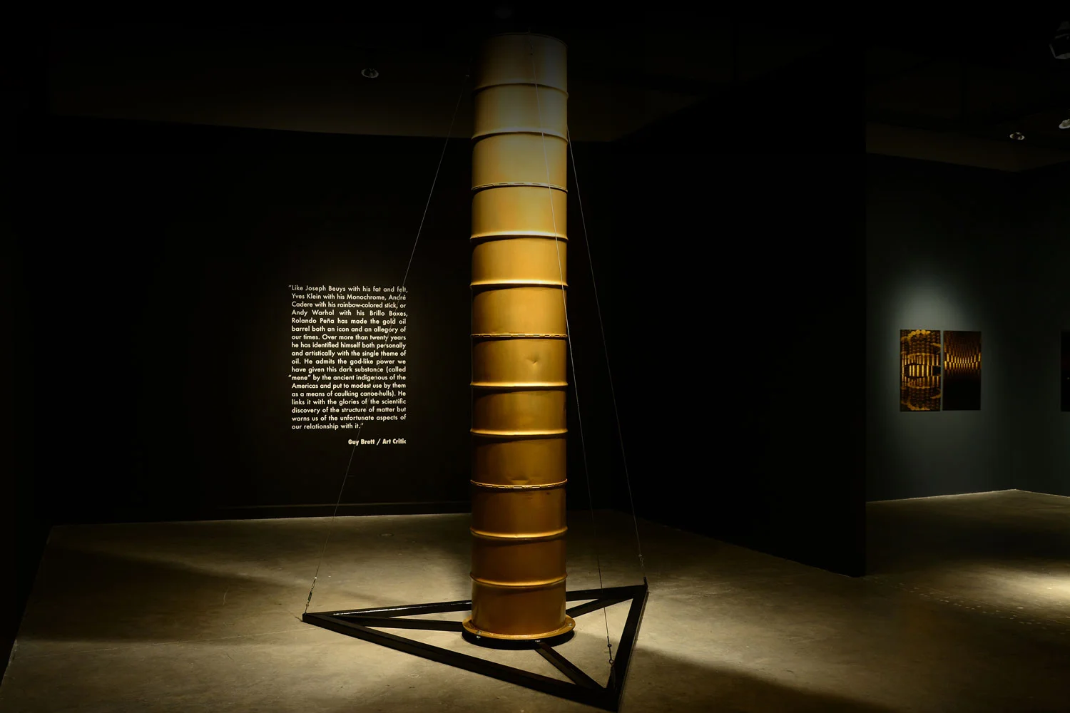As Andy Warhol chose a social consumption object that everybody recognized such as the Campbell’s Soup, becoming an icon of Pop Art, or as did Nobel Prize Leon Lederman in physics, naming the “Particle of God” to relate to the subatomic particle called the Higgs Boson, responsible for giving matter different properties. Peña creates a global symbol, with no language barrier, universal and essential component of our current lives on earth. As Robert Ebel of the Center for Strategic and International Studies states; “Far more than an ordinary trade commodity, (crude oil) it is a determinant of well–being, of national security, and international power for those who possess this vital resource and the converse for those who do not.”